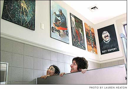 There is no place too sacred or profane for art in Yellow Springs, and the village’s newest art gallery venue in the public restrooms of the train station that houses the Yellow Springs Chamber of Commerce, is a little bit of both. Starting next weekend, locals and visitors are invited to use and peruse their loo with a view, which for one year will display the works of 19 local artists who have given their art over to a different kind of showplace, affectionately known as the ChamberPot Gallery. Local artist Nancy Mellon conceived of the idea for the most public of all galleries because she was noticing that people on the bike path would stop for a rest and a bathroom break at the train station and never step foot in the village, she said. Displaying art in the bathrooms would say something about the kind of town Yellow Springs is and, Mellon hoped, would draw people into town and make them want to experience more. “We’re a funky, arty town and what better place to show them than in the public restroom?” Mellon said. Local artist Corrine Bayraktaroglu, who has taken to placing her own surprise art in public spaces around town, became enamored with the idea of creating an unusual space for artists to display their work. She and Mellon both wanted to support the idea that “the whole town is an art gallery,” they said. After getting approval from the Village Design Review Committee and Village Council, who had to approve the plans for the gallery located in a Village building, and the support of the Chamber of Commerce and the Yellow Springs Arts Council, Mellon and Bayraktaroglu solicited standard 24"x36" works on canvas from local artists to hang on the upper story wall of both the men’s and women’s bathrooms for one year. Half of the pieces will hang on the women’s side and the other half on the men’s side, and after six months, the art will switch sides. What the artists received was a variety of work both from people they knew and from local residents they hadn’t known were artists, they said. Some of the submissions related to the bathroom theme, such as Bayraktaroglu’s “Got Paper?” oil painting of a laughing ghostly clown head, Amy Achor’s “Nature Calls” photo collage of the Yellow Spring and Rosie Huart’s mixed media piece using toilet paper. They also received art not at all related to the theme, such as Jason Morgan’s portrait of Thelonious Monk in a red wagon, and Parvis Dadras’s still life on a windowsill. Other artists participating in the ChamberPot exhibit are Anna Arbor, Sue Brezine, Shannon Crothers, Talitha Green, Leah Grommon, Patricia High, Jan Jackson, Matthew Laurenzi, Mary Peirano, Jean and Lance Rudegeair, Stephen Rumbaugh and Ken Simon. The gallery will host a grand opening during the Art Stroll on Friday, June 16, from 6 to 10 p.m., featuring guest appearances by classical guitarist Timothy Wolf, local poet Robert Paschel and hopefully a visit from the “toilet fairy.” Organizers will also post porcelain poetry and jake jokes around the gallery, sell souvenir potty portraits, and have an hourly drawing to give away wacky bathroom related prizes. Since Mellon and Bayraktaroglu began putting together the exhibit, they have learned a surprising amount about bathrooms, they said. For instance, there are many options to reference the commode, also known as the bog, the loo, the netty or the betty, as in “cloggy betty going to the netty,” the john, the W.C., the crapper, the jakes, the thunderbox, and the list goes on. Wanting to incorporate a little humor into their promotions, they went online and found whole cultures focused on potty talk, including a site called Bathroom Diaries that rates public restrooms and gave the train station a fairly high rating, according to Bayraktaroglu. The site also gives a golden plunger award for the best decorated bathroom, one Yellow Springs might aspire to once the art installation is complete. The main objective for the ChamberPot Gallery is to continue to support local artists and promote their creative work to as many people as possible, said Mellon and Bayraktaroglu, who are both members of the YSAC. The arts community in Yellow Springs is strong, and it’s part of what drew both of them to the village, they said. And the support they have received with this project has justified for them the town’s reputation. “I’ve never been in a place that has more support and embraces more artists,” Bayraktaroglu said. Contact: lheaton@ysnews.com