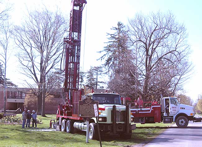 On Friday, April 9, employees of Crabtree Drilling of Springfield and Eaton Drilling of West Liberty drilled 300 feet down on the front lawn of the Antioch College campus in a first step toward determining the feasibility of using geothermal heating on campus.