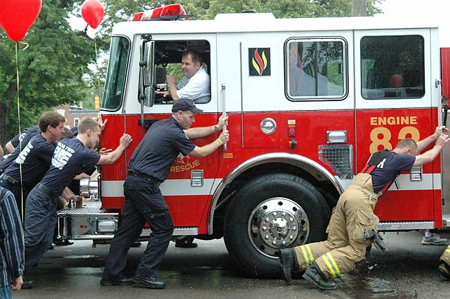According to firefighter tradition, a new engine first needs to be hosed down by the old engine, according to Altman, and accordingly the new engine was driven outside for its first washing, delivered by Powell. After that, according to the tradition, the firefighters push the new engine into the station to its new bay. Shown here, Powell drove #82 while the firefighters pushed the engine inside to its new home.