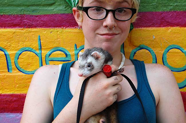 An unseasonably warm sunny day Tuesday brought villagers out to the streets, including Romy Farrar and her ferret, Grampa, who were relaxing in the pocket park between the Emporium and the Senior Center. Romy has had Grampa for two years, and he enjoys getting petted by friends and passersby. (Photo by Aaron Zaremsky)