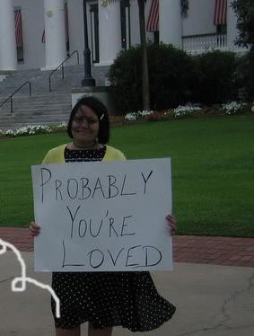But it occurred to the three of us that, though protest is common and so often necessary, it’s rare to see people holding up signs in support of anything, except at a ball game, pop concert or by “Twilight” fans. I can’t say which one of us had the idea, though I’d like to think it was born of all three of us simultaneously. Anyway, needless to say, we quickly made our own signs and headed down to the capitol building, to posit upon The Hassee our own message: