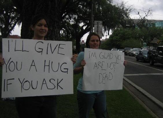 Yeah, so maybe it was a little cheesy, and certainly contrived, but we felt good doing it, and it was clear from the incredulous smiles of those passing that it made them feel good, too. The best part, though, was when a bunch of suits (and I mean “suits,” because they were literally all wearing the same style of suit) walked out of the capitol building. They saw us standing there, and I could see some of them immediately react physically, looking weary, thinking we were there to somehow bombard them with questions they wouldn’t or couldn’t answer. But then they read the signs. There was a pause. An elderly gentleman walked up to my friend Cherie, who was holding the sign offering free hugs.