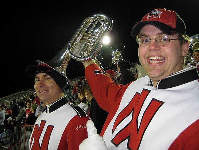 Yellow Springs native Brian Mayer, right, and his classmate Dan Mueller from Northern Illinois University played together in the school’s pep band. They will join their fellow graduates from NIU in a benefit horn, piano and vocal concert at the -First Presbyterian Church on Saturday, June 26, at 7:30 p.m. (Submitted photo)
