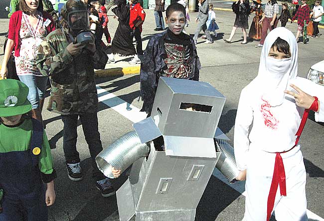 Last Friday, Oct. 29, Mills Lawn School students once again set out to spook downtown via the annual Halloween Parade. Ghosts, goblins and mischievous monsters of every type flooded the sidewalk and thrilled onlookers. Highlights were a walking iPod, a hot air balloonist, an six-armed spider, a pair of werewolves, a bulbous golden tea pot, and, at one point, three Darth Vaders in a group (which didn’t bode well for the Rebel Alliance).