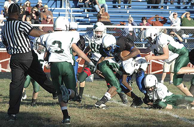Running back Ahmad Wagner charged through the Troy Christian defensive line in the McKinney School football team’s 52–20 loss on Thursday, Oct. 7. The home game was the final test of the season for the Bulldogs, who kept the game close in the first half. Wagner passed for 50 yards and rushed for 189 yards. (Photo by Megan Bachman)
