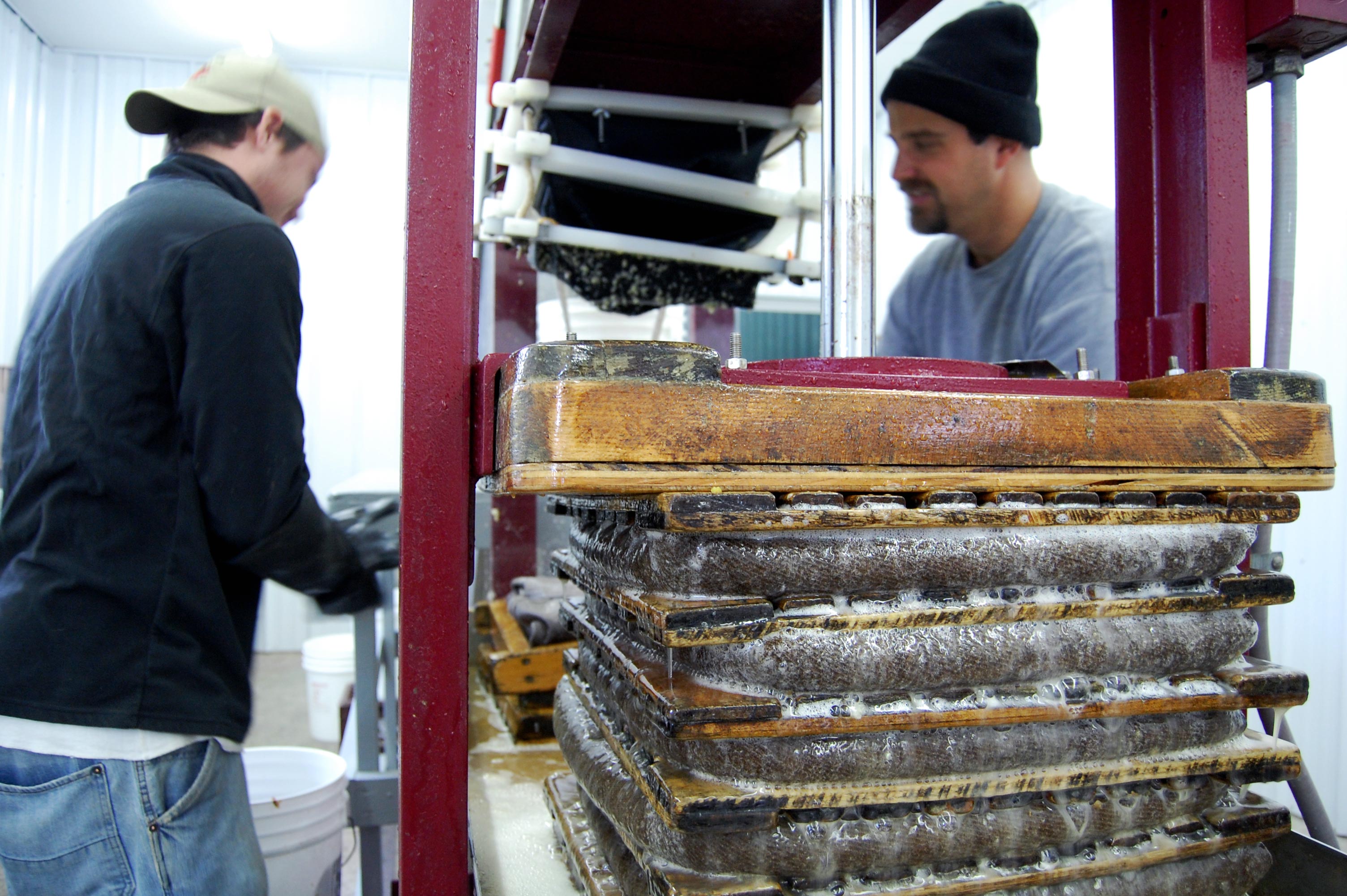 It all begins on roughly five acres of orchard trees that produce about fifteen different varieties of apples throughout the season: Goldrush, McIntosh and Jonathan to name a few. The workers pick the apples and store them in numerous coolers. The coolers are purposely without nitrogen-induced preservation. The workers load the apples onto the conveyer, which sends them through a shredder. The resulting apple pulp forms a sort of pancake. The workers wrap the pulp pancakes in cloth, and then repeat the process until they form a high stack. Then a presser squeezes every last delicious drop of liquid through a strainer and into a holding tank.