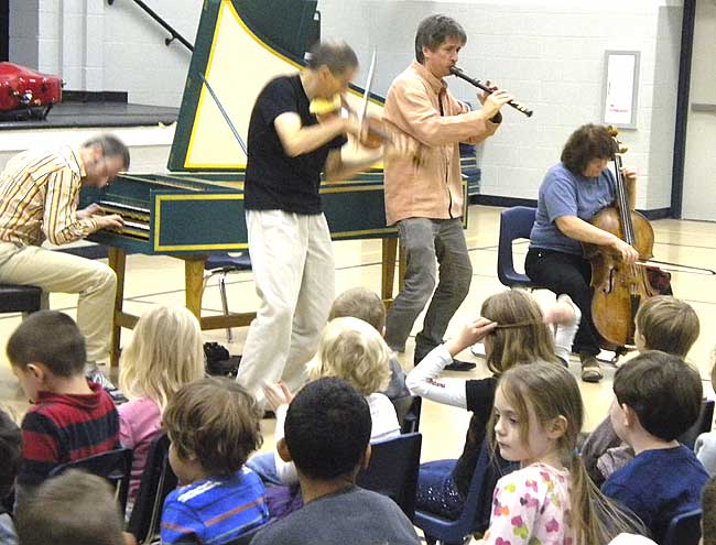 Mills Lawn School students got an ear- and eyeful of baroque music madness when the world-class ensemble Red Priest gave an entertaining as well as educational performance yesterday morning in the gymnasium. The group had performed the previous evening to a sold-out crowd as part of the Chamber Music Yellow Springs (CMYS) concert series at the First Presbyterian Church.