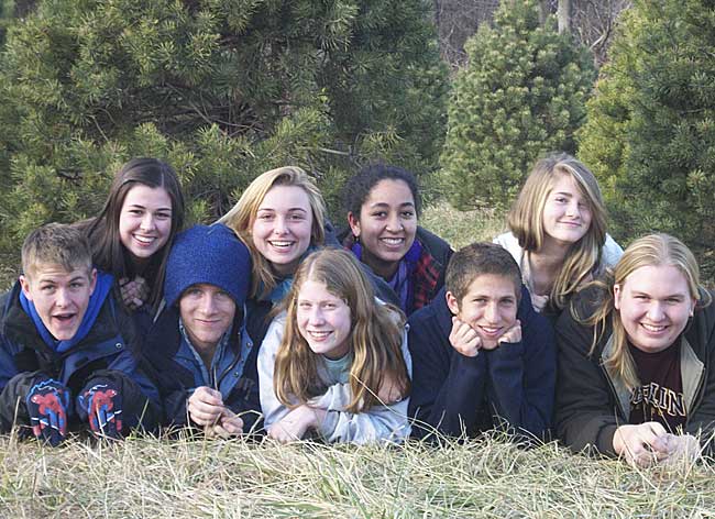 An energetic band of Yellow Springs High School Foresters welcome one and all to their annual Christmas tree sale this weekend near the pine forest off Bryan Park Road. The group will be out Friday night through Sunday morning ready to cut and haul the trees they planted and raised from seed. Pictured from left, Elliot Cromer, Tasha Fox, Nicky Sontag, Anne Weigand, Lois Miller, Savita Bathija, Jacob Trumbull, Lucy Callahan and Philip Kellogg prepped their trees this week in advance of the crowds they hope to draw to the group’s annual fundraiser. (Photo by Kelsey Cundiff)