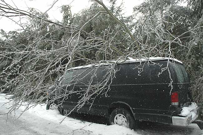 Not going anywhere soon: Last Wednesday morning a van on W. Davis Street seemed to shrink under the weight of the ice-covered tree that had toppled over during the ice storm the night before. Hundreds of limbs and branches fell during the storm, causing power outages all over the village. (photo by Lauren Heaton)