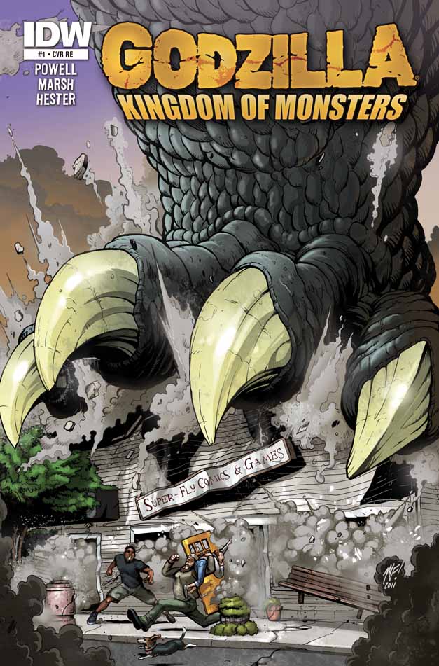 Yellow Springs’ own Super-Fly Comics and Games is one of 100 comic stores in the U.S. to be featured on a retailer-exclusive cover of comic publisher IDW’s Godzilla: Kingdom of Monsters #1. Each participating shop offers a unique cover, with the artwork featuring that shop being destroyed by Godzilla’s foot.