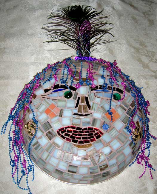 The “potheads” in Smith’s exhibit are just that: heads made from pots. Smith enjoys using recycled materials, and has gathered pots and pans from thrift stores, then covered them with mosaic glass and discarded stained glass. Smith created accents for her potheads from marbles, pebbles and old jewelry, and she made hair out of scrubbies and cellophane Easter grass.