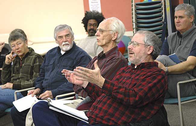 - About 50 villagers attended last Sunday’s forum on affordable housing, sponsored by the James A. McKee Association and featuring a presentation by local land trust organization Home, Inc. Shown above are, from left in front, Nancy Noonan, Kent Bristol, Al Schlueter and Dave Turner; in back, Brian Upchurch and McKee group president Rick Kristensen. (Photo by Megan Bachman)