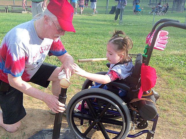 Mia Campbell is back. She’s 4 and according to her mom Carrie, “She loves t-ball. We always have a great time.” Which we love to hear at the Perry League. We try to be open to all our community’s children, no matter one’s ability or disability. Like Mia, who was born premature with spina bifida, who had to have a tracheotomy last year, as a 3-year-old; a kid who rolls up to the plate in her chair, who rolls onto the diamond in her chair, who is so happy on the diamond, especially when she comes up to the plate. It’s like being in a darkened movie theater, when suddenly the screen’s lit up and music booms at you from four directions at once: that explosion of sound and fury is Mia smiling, Mia beaming, as she rolls up to the plate wielding her bat in her left hand.
