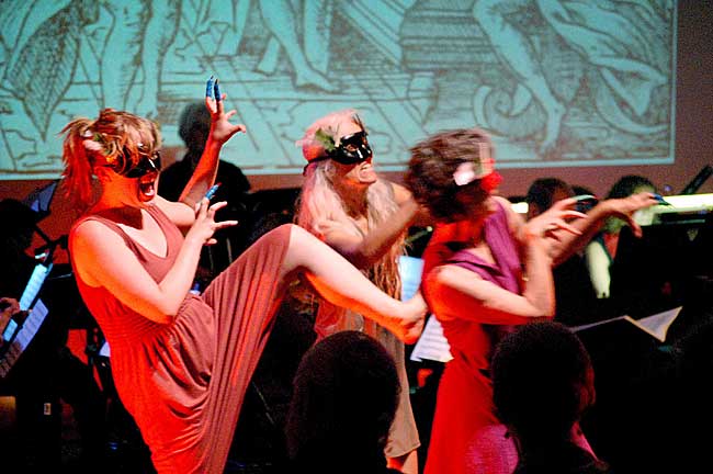Orfeo charms the gate keepers of the Underworld with the power of his lute and descends to find Euridice and the Elysian Fields, where dancers Elise, Erin Turner, Amelia Tarpey, Ali Thomas, all led by former Antioch College dance professor Jill Becker, sweep across stage brushing the air with silky veils. On their ascent, Euridice does not understand why Orfeo will not look at her, and driven by love, he turns to gaze at her, only to see her fall away into the blackness.