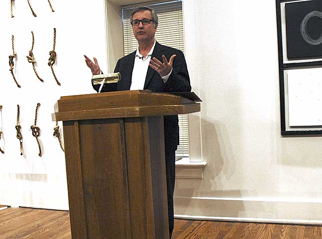 In his State of the College address Friday night, Antioch College President Mark Roosevelt articulated a new vision for Antioch as a college that will focus on addressing the challenges of sustainability. The May 20 talk, which was open to the community and held in Herndon Gallery, launched the weekend meeting of the college’s pro tem board.