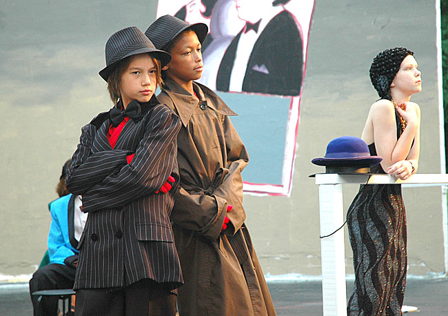 At the entrance to The Cotton Club, Old Hostess (Greta Kremer) stands by to receive the nightly guests, while gangsters Speak Easy (Jonah Trillana) and Peg-leg Bates (C.J. Johnson) lean in to wait for their boss, Big Frenchy, to enter and hustle up some dough for their bootleg hooch. The joint really starts jumping when the band starts tootin’ for the YS Kids Playhouse production of The Cotton Club, begining tonight, Thursday, July 7, at 7:30 p.m. at the college amphitheater. The show runs this weekend and next. (Photo by Lauren Heaton)