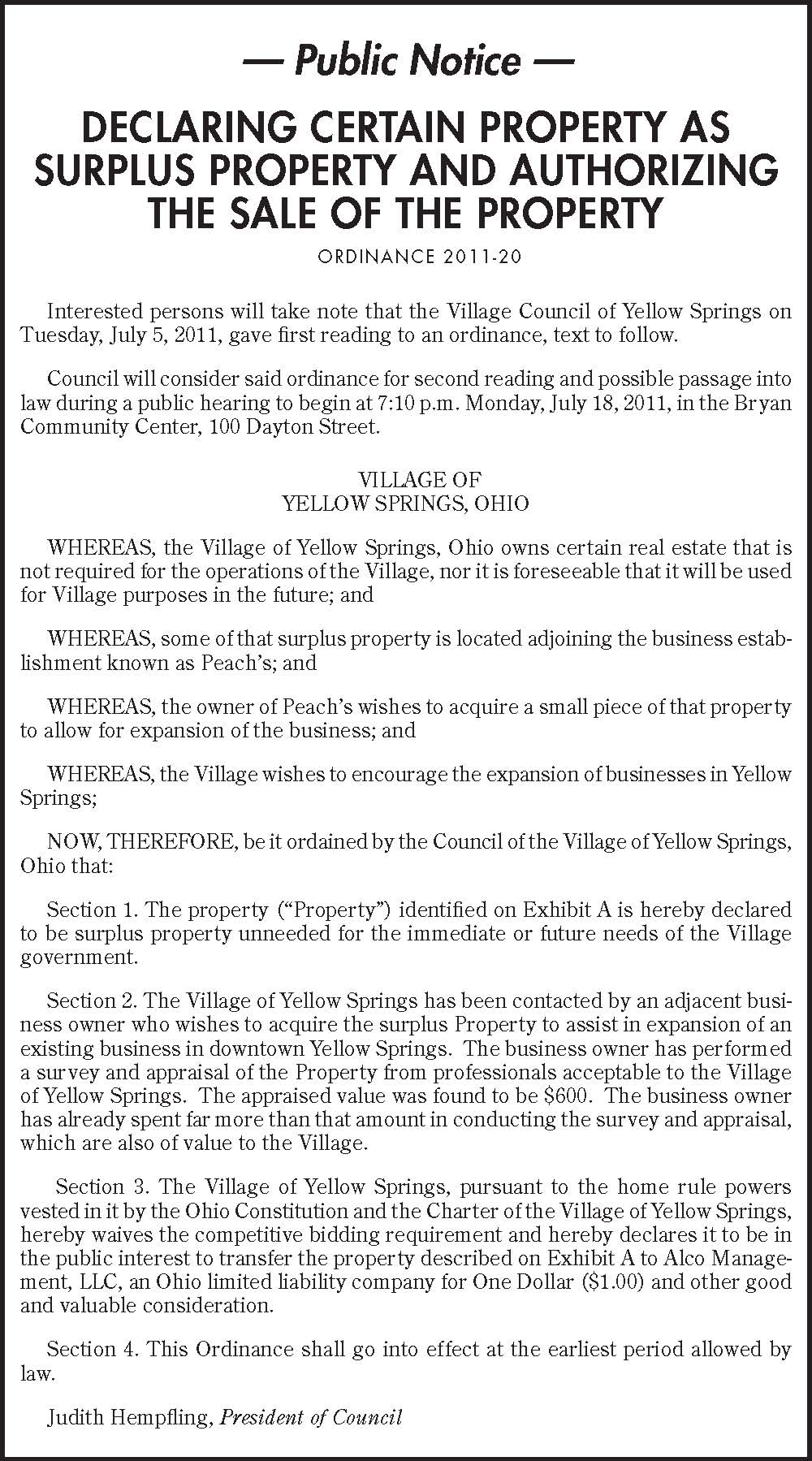 Declaring Certain Property as Surplus Property and Authorizing the Sale of the Property