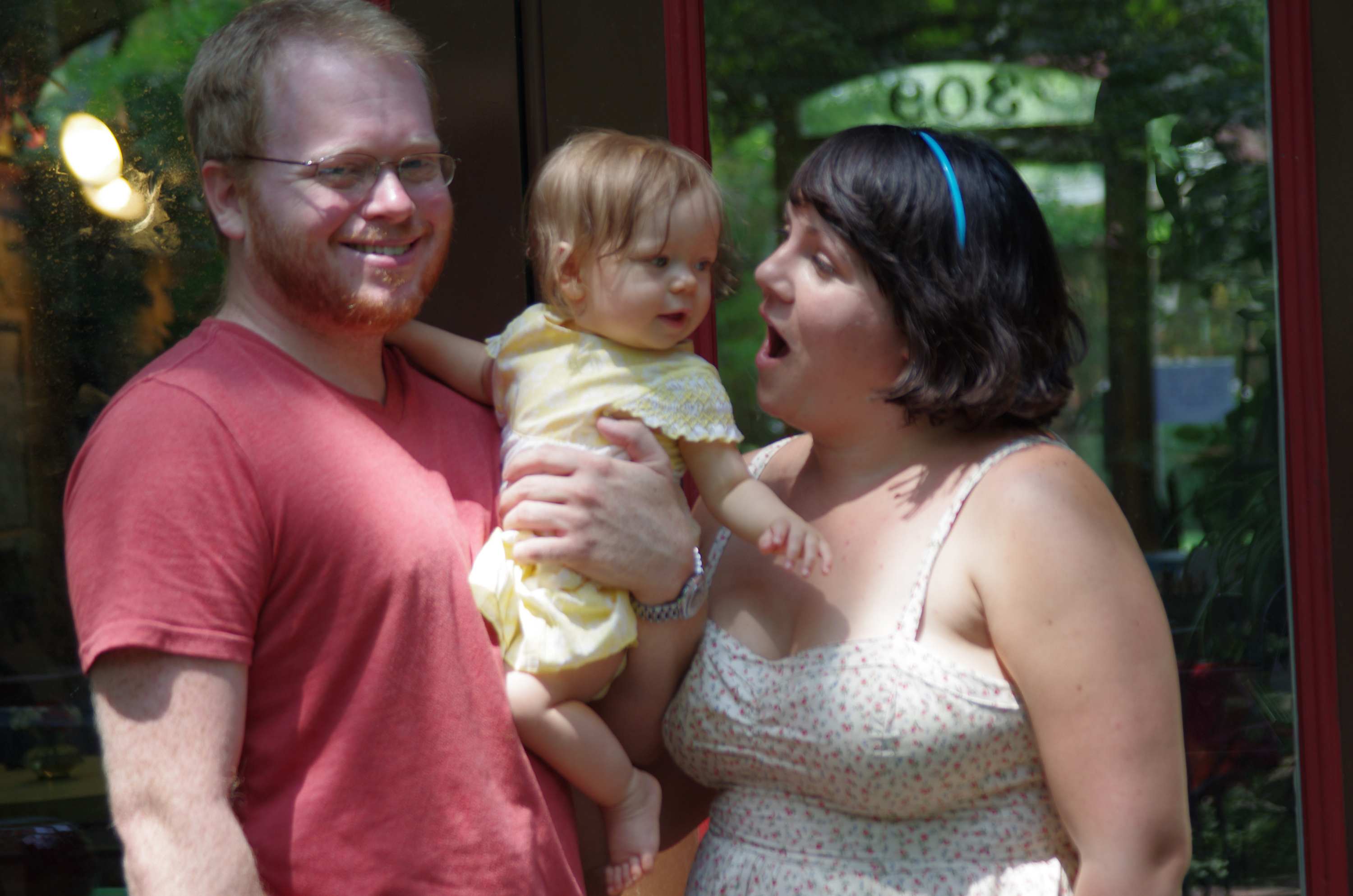 Local writers Anthony Fife and Lauren Shows, shown with their daughter Lucy Shows-Fife, have organized a series of literary events that take place at the Yellow Springs Arts Council. The second of the series, a poetry reading featuring Adrenne Cassel and Matt Vetter, will be held this Saturday, July 9, at 7 p.m., with music at 6:30 by pianist Mark Delozier. (Photo by Sehvilla Mann)