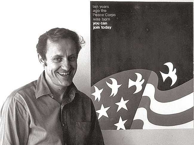 The design is graphically pointed and simple: a dark blue background with an American flag, whose stars morph into white doves taking flight. Battle, who was at the time vice-president and creative director of graphics at Vie Design Studio, created the logo in early 1971 as a call for entries to a poster contest for the Peace Corps in its 10th year. But that year was one of political change, as in July President Nixon folded Peace Corps in with other federal service groups into one ACTION agency. And while Battle was not privy to the internal politics, he did notice that Peace Corps failed to contact him about the printing of the poster. So he wrote the Corps a letter of inquiry, soon after which things got a little strange.