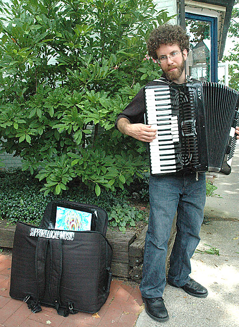 But regardless, Hemmendinger now finds himself living out his childhood fantasy. In the past few months he’s joined the world of Yellow Springs street musicians, and taken his place as its first accordion player. On summer days he can often be found in front of Tom’s Market, offering his improvisational blend of Eastern European and Irish music, with the occasional 60s rock tune thrown in.