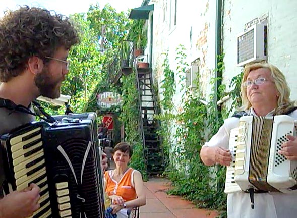 Yellow Springs passersby were treated to an accordion exchange Friday afternoon, Aug. 12, just next to the Emporium. Playing were local resident artist, musician and computer programmer Ben Hemendinger (read a profile on Ben and his accordion by Diane Chiddister), and Birkásné Sej Edit, one of several artists here on a cultural exchange from Budapest, Hungary through Wright State University.