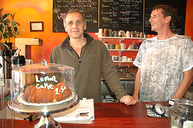 Brother Bear’s Coffeehouse regular Michael Herington, left, purchased the coffee shop from Patrick and Mindy Harney last month. The new Dancing Goats Cafe will still serve Brother Bear’s coffee in a more comfortable, classy space. Herington is shown here with barista Shawn Butts. (Photo by Megan Bachman)