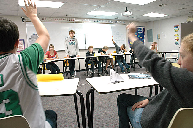 YSHS student facilitators Ben Green and Lucy Callahan, background, moderated a discussion for McKinney Middle School students on problem-solving school issues. The facilitators are part of an effort to train student leaders who can advocate for themselves and others to solve issues that youth find important. (Photo by Lauren Heaton)