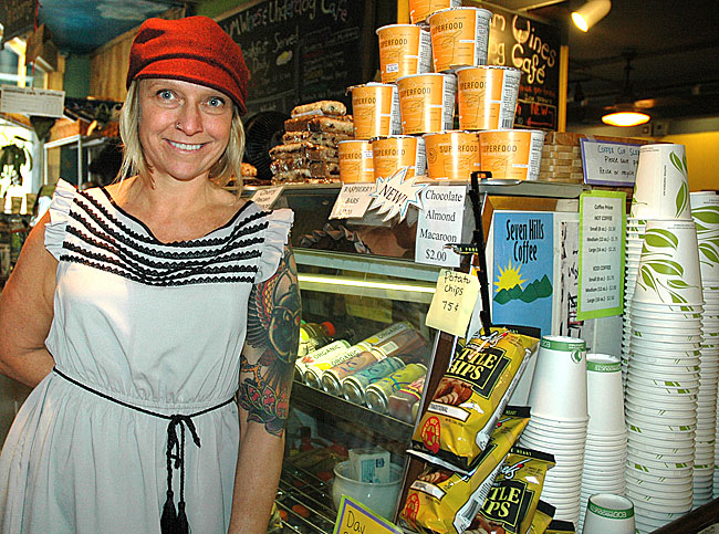 Wendy Copper of Yellow Springs, pictured above, and her business partner, Doug Siegal of Bloomington, Ind., have launched a new business, Vigilant Eats. Their first product, Organic Superfood Oat-based Cereal, is being sold at the Emporium/Underdog Café. You can find the cereal beside the oatmeal on the cream stand. (Photo by Diane Chiddister)