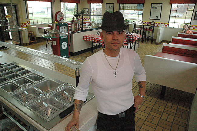 Last week the restaurant’s manager, Michael Randall, continued to hone the dining room’s retro look — he was busy repairing a set of drive-in speakers to pipe the ’50s jukebox music into the vestibule. He had recently stenciled a Yellow Springs sign for the dining room, plastered up archive prints of Yellow Springs News papers and photos and installed a red-and-white tiled buffet.