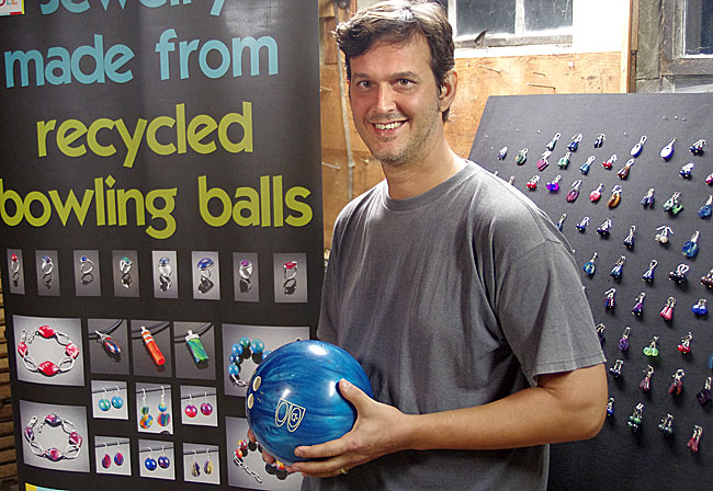 New village resident Matt Cole uses an original material for his hand-crafted jewelry: bowing balls. An avid bowler, Cole has for the past several years designed earrings, bracelets and pendants from the richly colored outer layer of the balls.