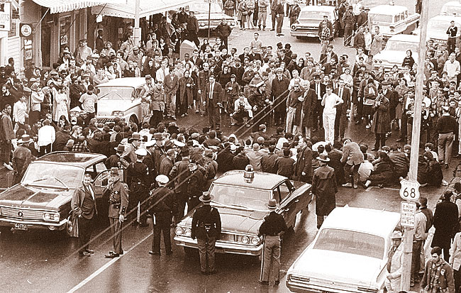 Hundreds of local and area students, residents and law enforcement officials jammed downtown Yellow Springs on Xenia Avenue during a chaotic March 1964 demonstration against Lewis Gegner for refusing to cut the hair of black people at his barbershop. Fifty years ago this month, African-American resident Paul Graham began a legal case against Gegner that reached the Ohio Supreme Court. (Photo courtesy of Scott Sanders, Antiochiana)