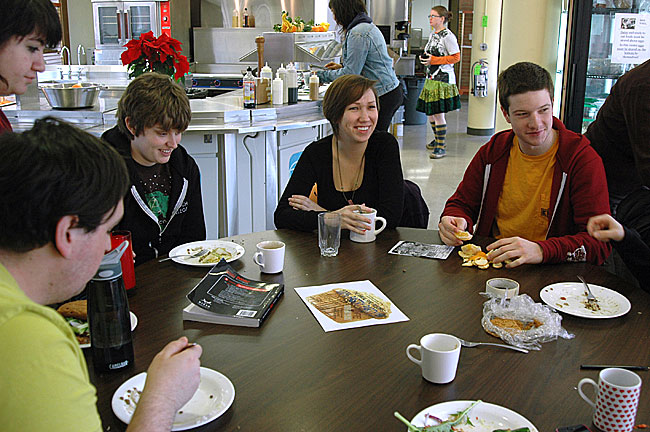 Antioch College students recently ate lunch in their cafeteria, which serves mostly non-processed food increasingly sourced from the campus farm. The Antioch experience so far has been stressful but rewarding, said students, who have to go to class, do homework, work on campus, govern themselves and cook for one another on weekends. At the table are, from left, Eros, Eva Erickson, Jennifer Carlson and Elijah Blanton. (By Megan Bachman)