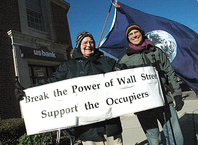 Village resident Eric Wolf, right, organized an Occupy protest in Yellow Springs last Friday in front of US Bank on Xenia Avenue to criticize the bank’s practices. Bill Houston, left, was one of the 34 local people who raised their voice with Wolf to draw attention to wealth disparity and economic injustice in the U.S. (Photo by Megan Bachman)
