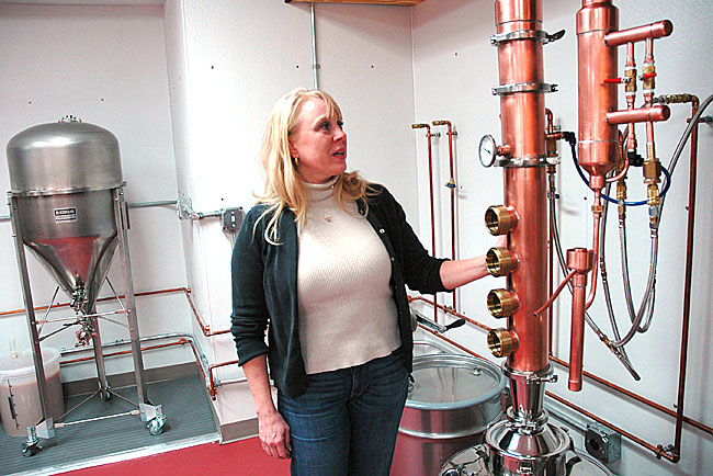 Meg Gujer of S and G Artisan Distillery showed off the new local company’s still in its MillWorks production space. Beginning in 2012, S and G will produce fruit schnapps and other liquors using authentic German methods and recipes under the brand, The Spirits of Yellow Springs. (Photo by Megan Bachman)