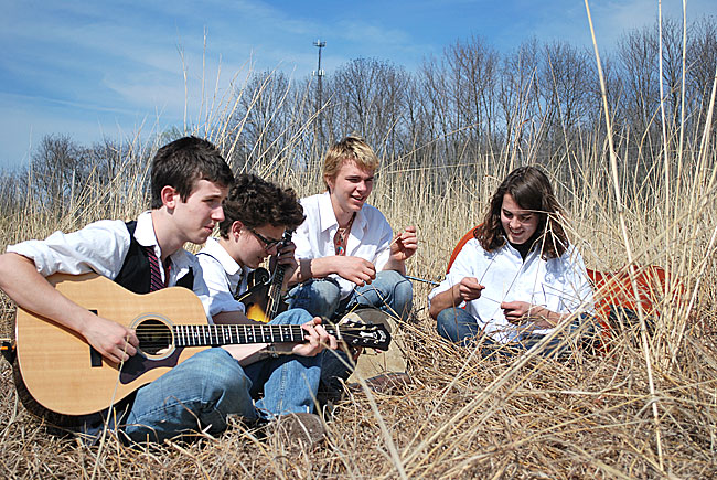 Wheels members Rory Papania, left and Sam Salazar, second from left, met at Friends Music Camp in 2009. Now the band, which also includes Friends Music Camp alums Jamie Scott and Sam Crawford, right, along with Connor Stratton (not pictured), will perform at a benefit concert for Friends Music Camp’s scholarship fund on Friday, Dec. 30, at 7:30 p.m. at the Yellow Springs Senior Center. (Submitted photo by Savanah Amos)