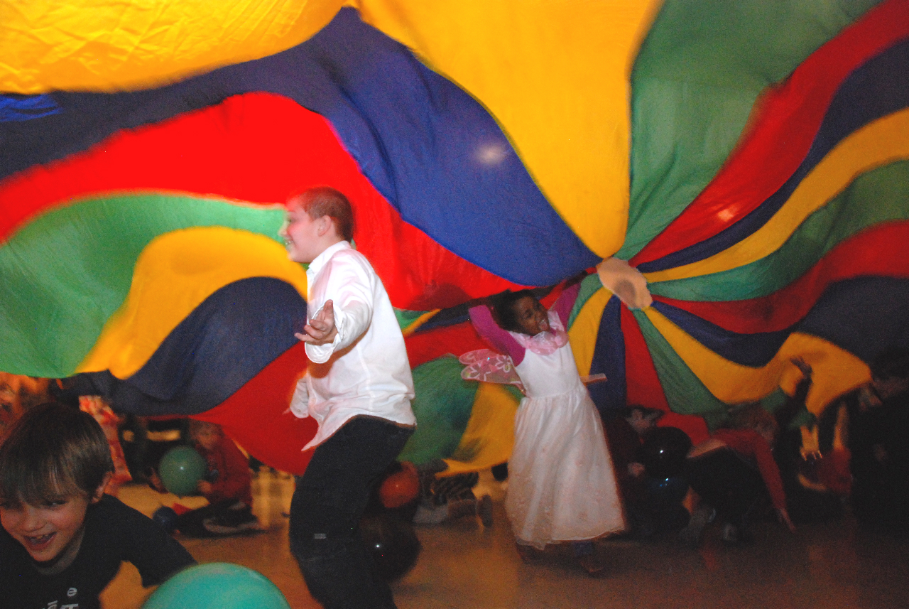 Last week’s Yellow Springs Montessori School fundraiser included, left to right, Tyson Housh, Sven Meister and Gini Meekin, who found themselves in a moment of flight under the parachute. The event, “Anything Flies,” took place at the Presbyterian Church and featured the Pop Rocks band, paper airplanes and other flying objects.