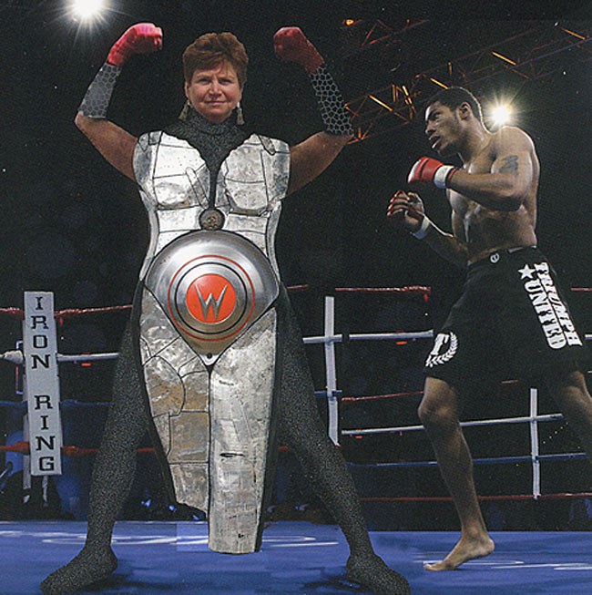 While Stein has considered herself a feminist for decades, it’s taken a while for her to focus her art work on gender issues, she said in an interview in The Progressive magazine. She ran a successful calligraphy business in New York City, making art on the side, but had her world upended by 9/11, which forced Stein and her co-workers to flee her downtown studio. When after several months she began to make art again, Stein found that her art had changed: once purely abstract, she now was drawn to figurative sculptures. Her first post-9/11 group of sculpures were torsos of female knights, using fiber, leather, metal, bone, rope, paper, stone and wood.