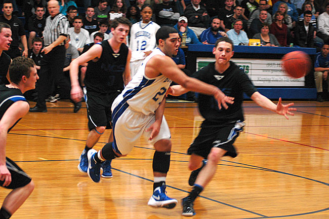 Junior Robbie Jones played his best game of the year during the Bulldogs’ rematch against Middletown Christian on Friday. Jones, here dishing out the ball after driving into the paint, was dominant on both sides of the court and led scoring for the team, with 17 points. YSHS won the game, 64–59, after losing to Middletown Christian in double overtime on Jan. 13. Visit www.ysnews.com for more game photos. (Photo by Megan Bachman)