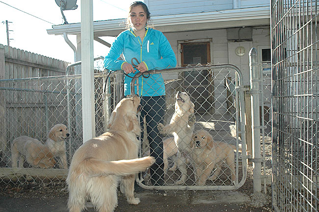 Israeli resident Yarden Oron came to the village last month to learn how to train the seizure alert dogs that help especially kids with epilepsy. She now works with Veera, above, at 4 Paws for Ability in Xenia, and regularly visits the golden retriever puppies who are raised there as future service dogs. (Photo by Lauren Heaton)