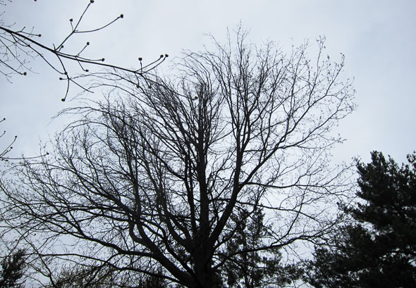 Our family upheaval began on Monday, and so that evening I welcomed the respite of a lecture on tree stewartship by arborist Robert Moore. A plant health specialist with the Green Canopy Group, Moore gave us a clear eyed assessment of the area’s trees. To be honest, Yellow Springs’ report card was mixed. Winter is an excellent time to take stock of our stately neighbors. With their branching free of leaves and clearly visible, one can see the consequence of many years. A healthy tree, Moore told us, tends to have a dominant leader, a single trunk growing upward from which all other limbs branch. Secondary branches allowed to outgrow the leader cause weakness and make the tree susceptible to high winds. Healthy trees have a regular symmetry in their canopy, and their stems gradually resolve from thick branches to thin. Moore showed us many examples of trees under stress and, often, his examples were trees planted too close to curbs or buildings frustrating root growth. He walked us through the process of compartmentalization in which trees isolate their wounds. Small, clean wounds close over almost seamlessly while larger wounds remain as clearly visable scars.