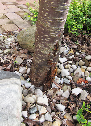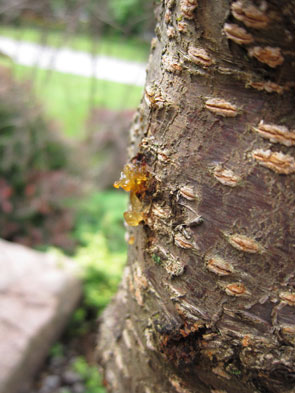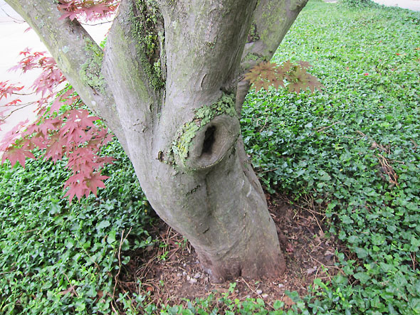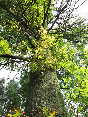In terms of maintenance, pruning, watering through droughts, and protecting the roots keep trees healthy. Roots need protection from compaction. A thin layer of mulch surrounding a tree to the edge of its canopy does much to prevent lawn mower “blight”, and a fence will protect roots from the heavy traffic during construction projects that might otherwise kill well-established trees. Pruning when trees are young promotes a scaffold structure that prevents crossing branches and competition over sunlight. During a drought, trees should get priority in watering over lawns. Due to the fall droughts of 2009 and 2010, many area trees were lost. At our house, we lost a beautiful weeping cherry. The tree’s stress escaped our notice until the spring when it failed to leaf and sap bled from its trunk. Pulling back a competing vine from the tree’s base revealed the canker where the tree blew out in its suffering.