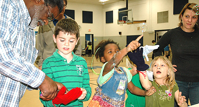 Hands-on stations included everything from soap bubbles to math games, from colored milk “lava lamps,” to the building of two geodesic domes constructed from rolled-up newspapers (courtesy of yours truly).