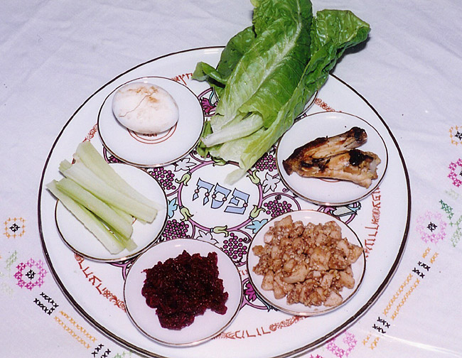 A Passover Seder Plate showing (clockwise, from top): Maror and chazeret — Bitter herbs, symbolizing the bitterness of slavery  which the Hebrews endured in Egypt; Z'roa - A roasted lamb or goat shankbone, symbolising the Passover  sacrifice; vegetarians often substitute a beet; Charoset — Apple, nut and honey paste representing the mortar used by the Jewish slaves to build the storehouses; Karpas — A vegetable which is dipped into salt water representing tears shed by Hebrew slaves; Beitzah — A hard-boiled egg, symbolizing the festival sacrifice and roasted and eaten as part of the Seder meal. Some Seder plates also include an orange to represent those considered out of place in more conservative Jewish teachings. (Photo from Wikipedia)