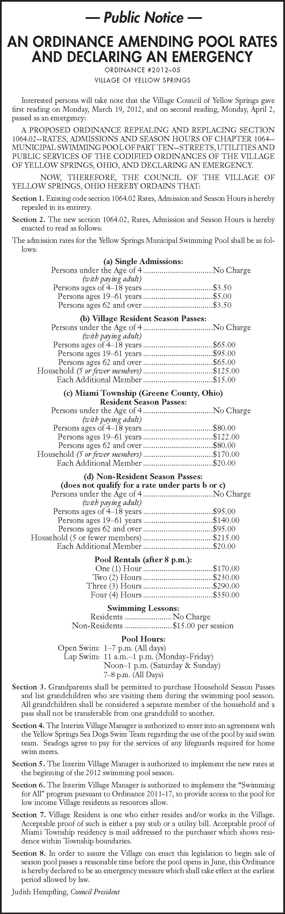 Ordinance Amending Pool Rates and Declaring an Emergency