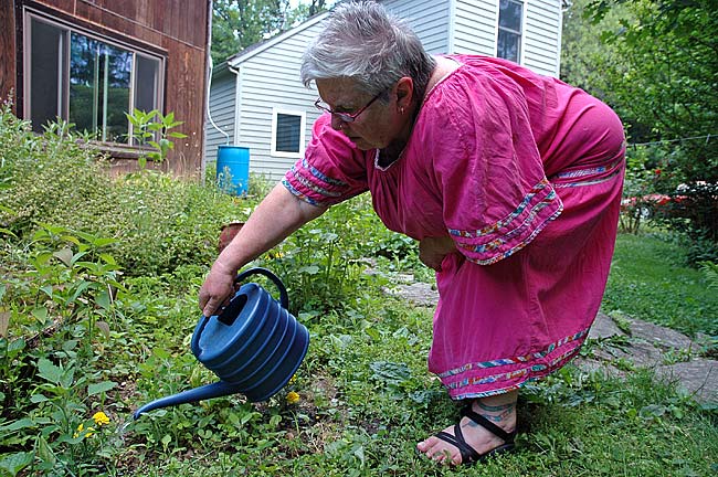 Laurie Dreamspinner used the water from one of the four rain barrels connected to her downspouts to water the marigolds, peas and herbs she grows in her front and side yards. The stormwater reclamation saves her money and the already wet area unneeded runoff. (Photo by Lauren Heaton)