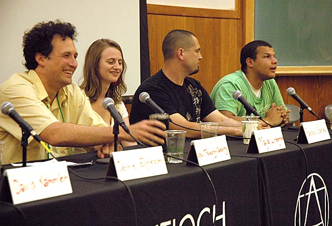 At the “Antioch Today” panel at this weekend’s Antioch College alumni reunion, students, staff and faculty reflected on the trials and triumphs of college life in the middle of the revived school’s first academic year. From left, are Assistant Professor of Philosophy Lewis Trelawny-Cassity, student Maya Lundgren, Resident Life Manager Randle Charles and student Guy Matthews. (Photo by Megan Bachman)