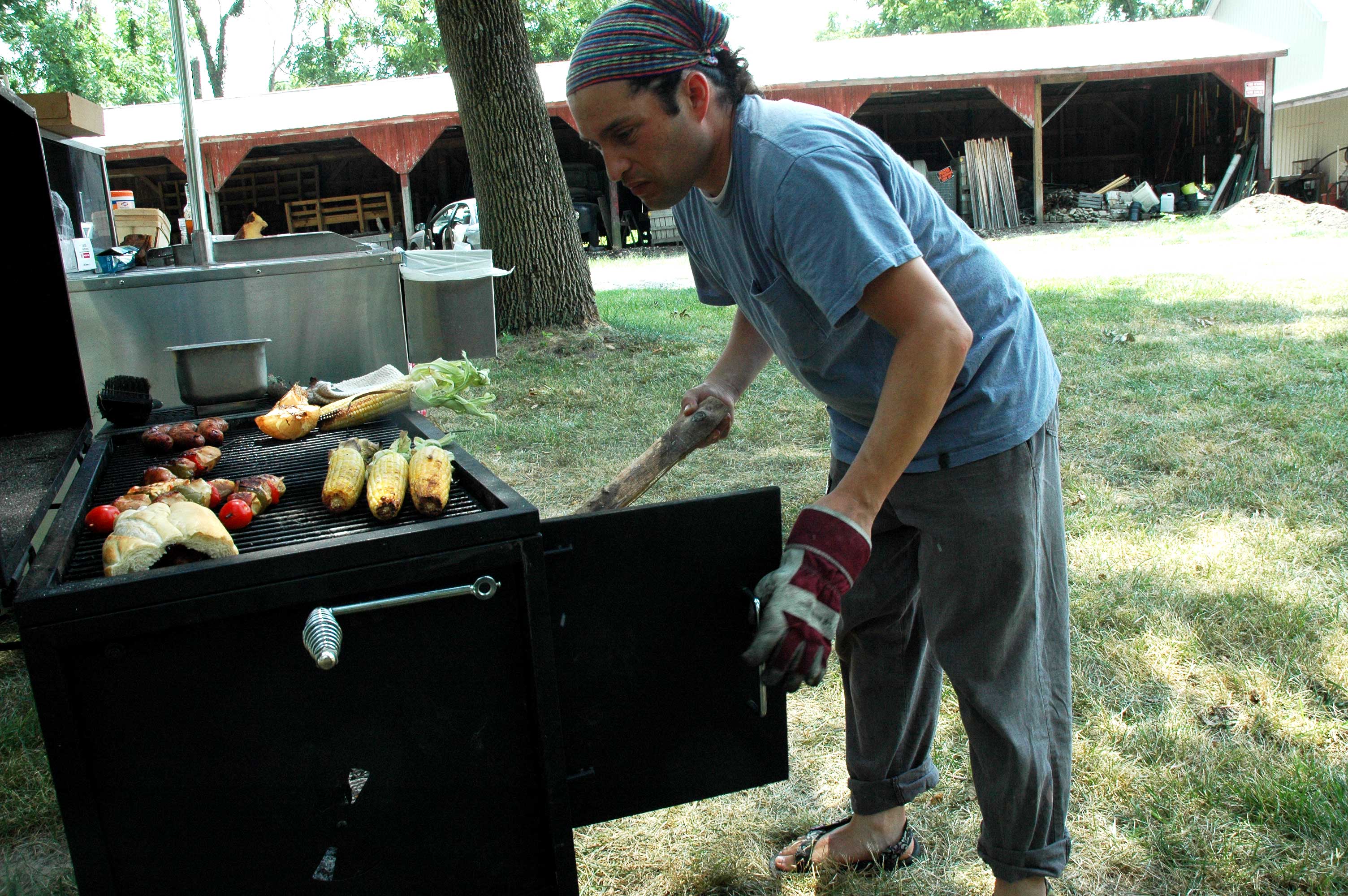 The library event is just the beginning. This past Sunday, Rios and his wife, Luisa Bieri Rios, and son, Tomé, were spread out on a picnic blanket in the grass at Peifer Orchards. The parilla was hot with saffron chicken and veggie kabobs, corn and onions and grilled chorizo sandwiches, or choripan, an Argentinian street food favorite served with chimichurri sauce. Customers coming to the farm for fresh peaches, blackberries, melons and other vegetables stopped by to check out what was cooking. It was the first day for Rios’s new Argentinian grill and catering business, La Pampa, which will be at Peifer’s most Sundays offering grilled selections from the area’s seasonal harvest. La Pampa is the realization of all the culinary and community influences in Rios’s life. He means to use his asado to provide highly flavorful food in a highly localized way, with ingredients cultivated in the community to be consumed by the community. The meat and vegetables are locally sourced — the chicken comes from New Liberty Farms, the chorizo from Blue Jacket Dairy, and the vegetables from many of the local farms. And while customers can take their food to go, they are also welcome to stay a while, spread out their own blankets and hang out with their children and pets for a meal in the shade — such as they might do on an asado Sunday in Argentina.