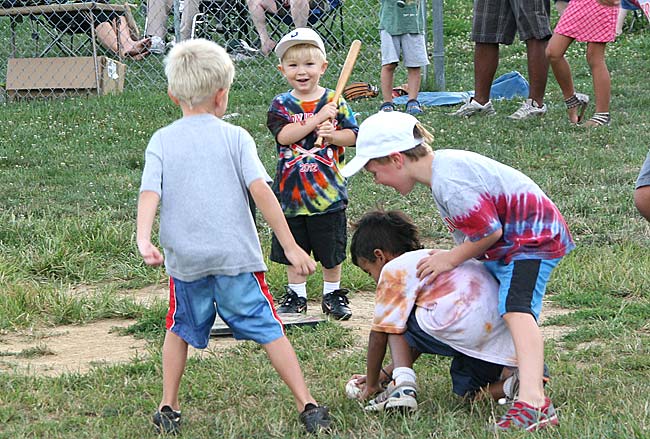 And this is our Perry League, Yellow Springs’ t-ball program – children being thoughtful in ways that surprise and charm you; children being honest and moral in ways that impress and inspire you; children being loving in ways that cut deep, opening up their hearts to you, letting it all pour out. And I thank you, you moms and dads, you grandmothers and grandfathers, you aunts and uncles, you big brothers and big sisters, for letting this happen. And I thank you, my glorious, miraculous t-ball children, for your love is tonic, another healing, soothing layer of dressing for my poor battered, wounded child’s heart — I, a “child of chaos,” the product of a family devastated by violence and addiction — I am grateful. I come to T-ball and my heart soars, my wounds, recently opened, close and heal. The love, not there when I was 2, when I was 3, 4, 5, or 6, it is there now, for me, for any and all of us who dare to be open to it, who dare to give it, who dare to let it in, who dare to soak it up. It is there, all summer long, on that t-ball diamond with those t-ball darlings.