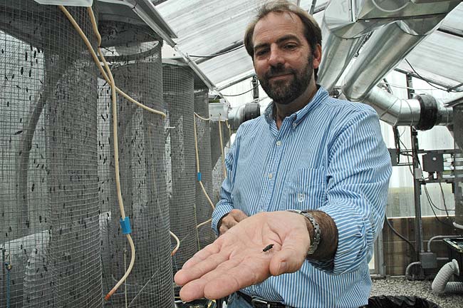 Visitors to MillWorks can expect to see an occasional long-bodied black fly loitering outside the greenhouse Courtright calls the “Barry White room.” Inside, even at night, it is always a balmy, tropical day, with a balance of tunes from Pink Floyd, Indian pop and Barry White to set just the right mood for the tens of thousands of flies to mate and lay their precious eggs. The eggs quickly grow into the hungry larvae Enviroflight uses to process distillers grains into an animal feed that is higher in both protein and fat than when it arrived. The ration will feed, among other animals, sustainable farm-raised fish in a state that is ripe for growth in aquaculture, or commercial fish farming.
