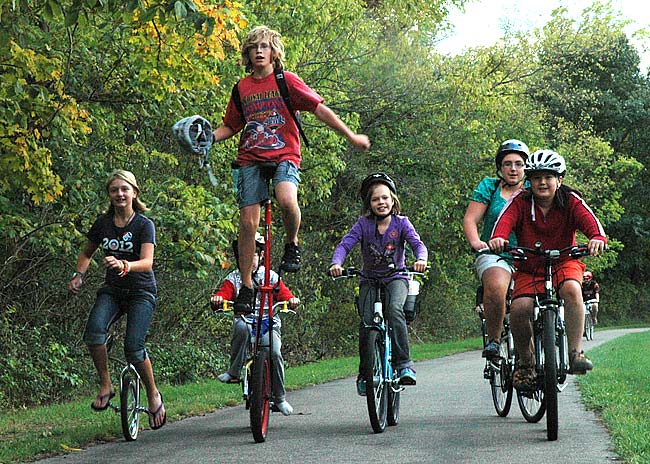 The Antioch School held its recently-revived Anything On Wheels fundraising event Sunday, Sept. 23, where students, both present and past, ride from the school on Corry Street to Xenia and back for a total of about 15 miles on bicycles, unicycles, skateboards — anything on wheels. Experienced riders can choose to go the whole distance, while those new to wheels can ride around the path surrounding the school playground. Pictured above are, from left, graduate Jorie Sieck, Sam Linden (obscured), graduate Zack Brintlinger-Conn, Evelyn Potter, graduate Samantha Bold and Zenya Hoff-Miyazaki. Sieck and Brintlinger-Conn rode the entire 15 miles on unicycles, accompanied by Bold and Hoff-Miyazaki. They were met in the last stretch by their peers who had finished and circled back to bring them home. (Photo by Matt Minde)